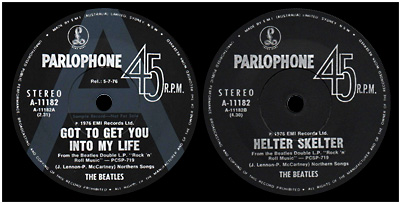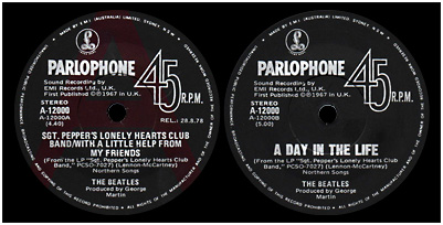 Promo singles issued during the 1970s used regular labels with a large blue-grey "A", or a red "A" in the case of 'Sgt Pepper's...'/'A Day In The Life', printed on the A-side label. The single's release date was also printed on the A-side label.