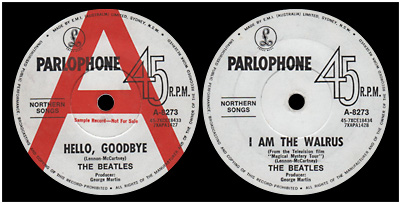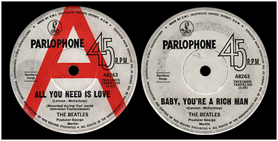 In mid-1967, EMI (Australia) adopted a white label, with a large red "A" on the A-side, similar to the style EMI UK had used since the early 1960s. Ironically, as EMI (Australia) was phasing the label style in, EMI UK was phasing it out! Promo copies of 'All You Need Is Love'/'Baby, You're A Rich Man' and 'Hello, Goodbye'/'I Am The Walrus' appear with this label style, the latter with "Sample Record—Not For Sale" printed in red centrally under the centre hole.