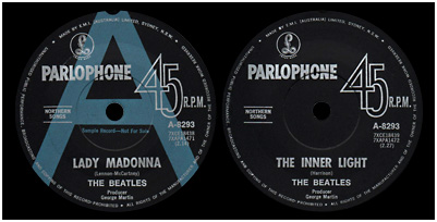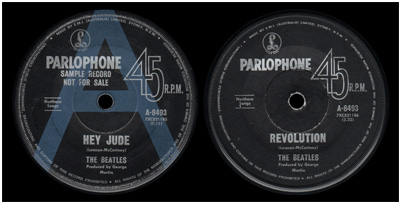 From early 1968, promo singles were pressed with regular black labels with a large light blue "A" printed on the A-side. Promo copies of both 'Lady Madonna'/'The Inner Light' and 'Hey Jude'/'Revolution' appear with this label style, the latter with "SAMPLE RECORD NOT FOR SALE" printed in silver under the Parlophone logo.