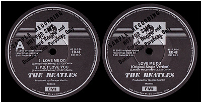 Promo copies of 'Please Please Me'/'Ask Me Why' had a rectangular sticker stating "SAMPLE RECORD (NOT FOR SALE)" plus a copyright warning affixed to the regular A-side label. Prior to the release of 'From Me To You'/'Thank You Girl' in May 1963, the rectangular sticker was replaced with a round red and white sticker—known colloquially as the "bullet sticker"—simply stating "SAMPLE RECORD NOT FOR SALE". The bullet sticker graced all subsequent promo singles up to and including 'Strawberry Fields Forever'/'Penny Lane'.
